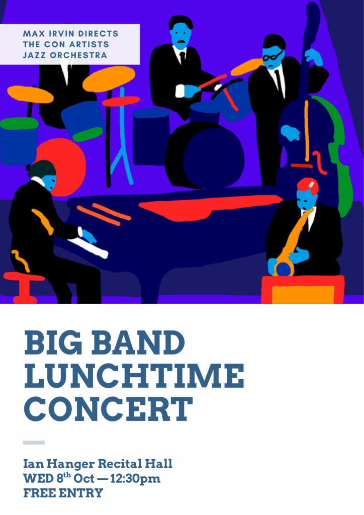 Honours student, Max Irvin, directs the premier Con Artists Jazz Orchestra in a short lunchtime concert, presenting the music of Maria Schneider, Herbie Hancock, and Wayne Shorter. As a part of his Honours Project Study, Max has prepared music and conducted rehearsals in preparation for the role of a jazz big band director post studies.
